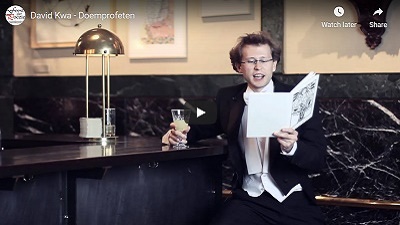 David Kwa draagt zijn prozagedicht 'Doemprofeten' voor in de sociëteitszaal van kunstenaarsvereniging Arti et Amicitiae te Amsterdam, in aanloop naar het vierde Feest der Poëzie.