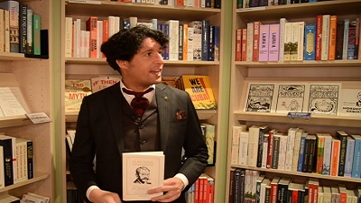Arjan van Vembde brengt een deel uit zijn poëtische magie-act in de sociëteitszaal van kunstenaarsvereniging Arti et Amicitiae te Amsterdam, in aanloop naar het vierde Feest der Poëzie.